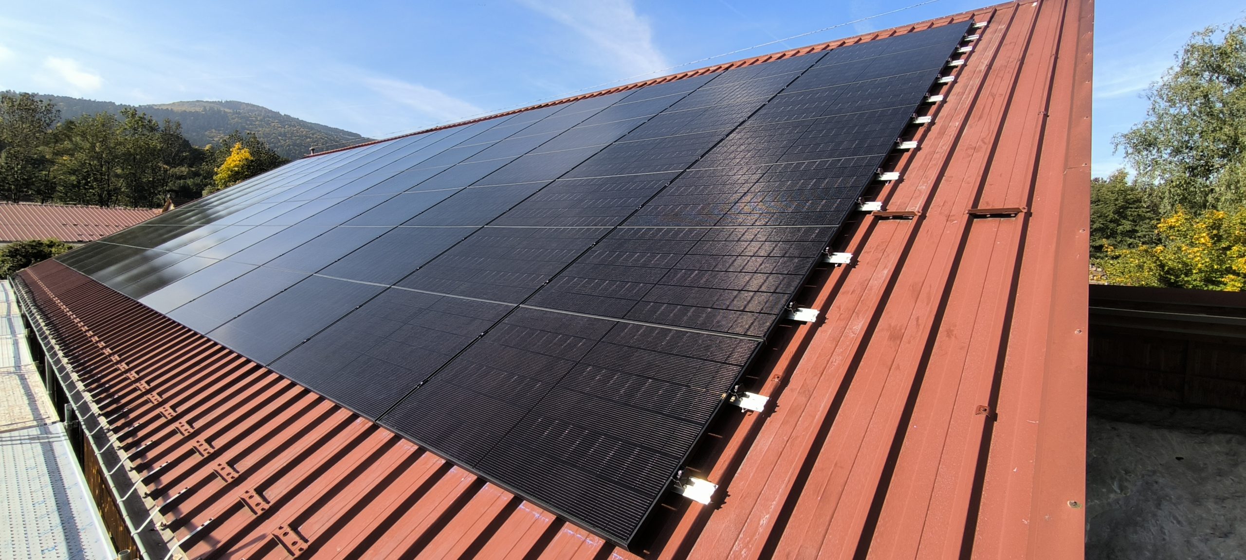 La commune de Masevaux-Niederbruck est propriétaire d’ouvrages énergivores : ateliers municipaux, station de pompage d’eau potable, station d’épuration. Avec ces seuls bâtiments, dont la consommation est constante et élevée tout au long de l’année, la quasi-totalité de la production solaire est absorbée. 91 panneaux solaires de la marque Panel Vision, d’une puissance de 450 Wc chacun sont installés par l’entreprise Bauer, pour une puissance totale de 40,95 kWc. La collectivité ayant bénéficié des subventions Climaxion à l’investissement, un contrat ad hoc avec un responsable d’équilibre doit être signé avant le raccordement de la centrale auprès d’Enedis. Pour le moment, c’est la société 3 E-RL qui réalise cette prestation. Une convention d’autoconsommation collective a également été signée avec Enedis qui assurera le comptage des données de consommation et production pour ensuite les répartir selon la clé de répartition dynamique par défaut.